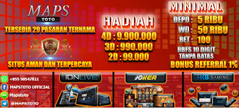 MAPSTOTO merupakan agen penyedia taruhan togel online dengan berbagai macam pasaran resmi dan lokal, Seperti Singapore, Hongkong, Sydney dan pasaran WLA resmi lainnya yang bisa anda mainkan disetiap saat. MAPSTOTO juga dikenal memilik kredibilitas baik serta menjunjung tinggi nama baik, Demi meningkatkan pelayanan dimata masyarakat pecinta togel online seluruh Indonesia. Proses transaksi cepat, Pelayanan maksimal 24 jam online dengan admin profesional melayani keluhan member. Soal bayaran MAPSTOTO sudah tidak diragukan lagi, Menang berapapun pasti terbayara lunas.. Ayo.. tunggu apa lagi sobat..?? Segera daftarkan diri anda sekarang juga bersama MAPSTOTO.